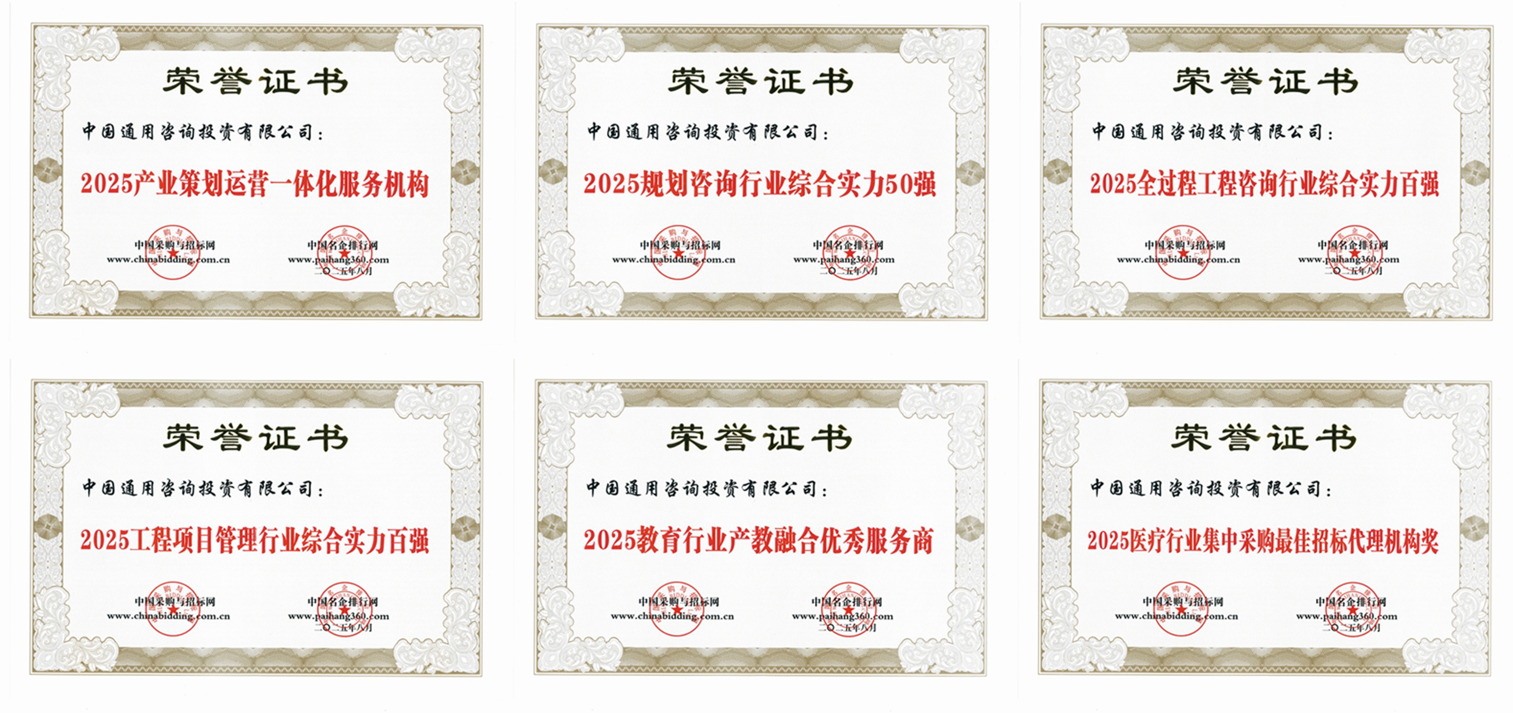 通用技術通用咨詢榮獲招投標領域年度聚焦活動六大獎項 近日,在2025年第19屆招投標領域年度聚焦活動中,通用技術通用咨詢一舉榮獲“ 2025產業策劃運營一體化服務機構”“2025規劃咨詢行業綜合實力50強”“ 2025全過程工程咨詢行業綜合實力百強”“2025工程項目管理行業綜合實力百強”“2025教育行業產教融合優秀服務商”“2025醫療行業集中采購最佳招標代理機構獎”六大獎項。